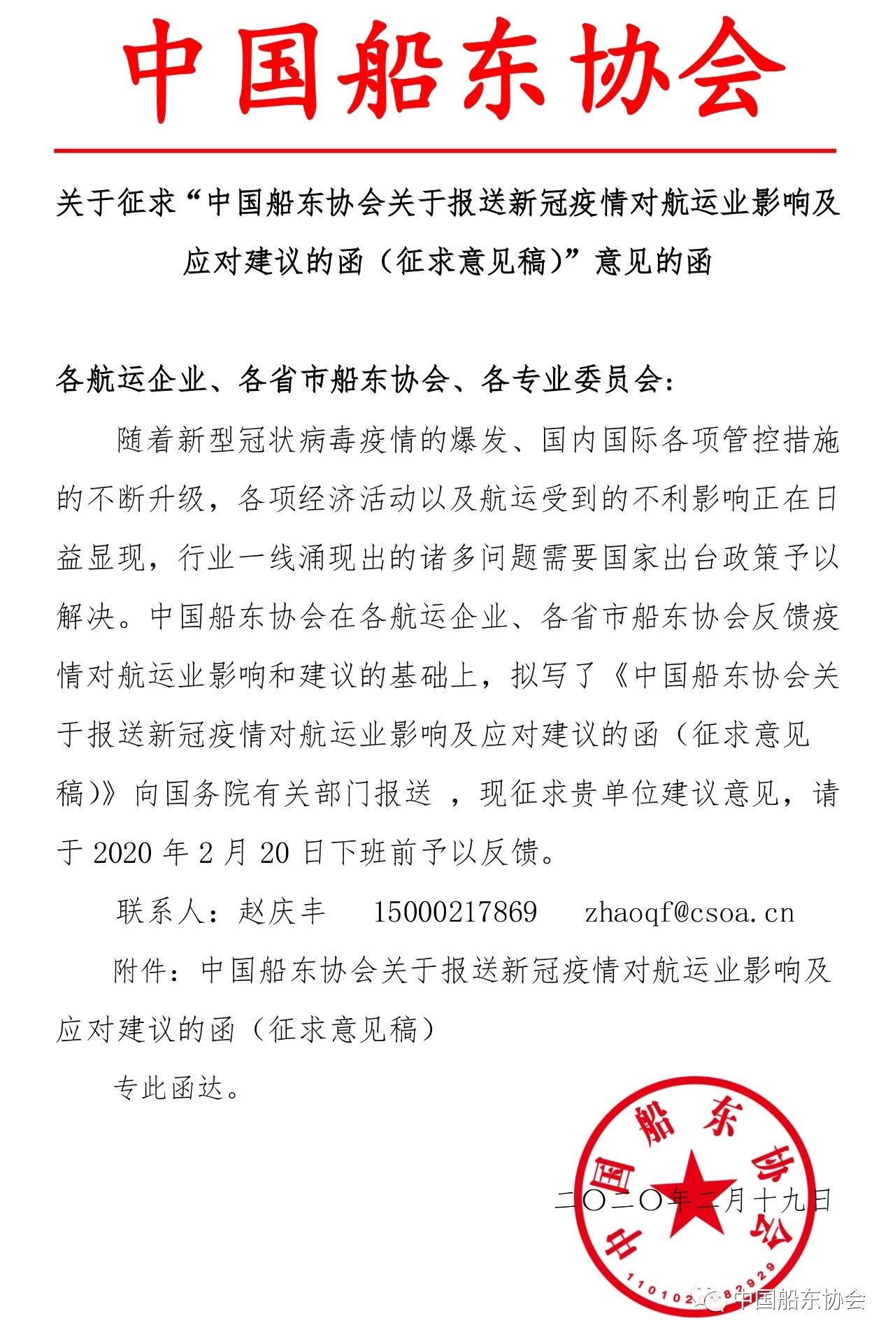 关于征求“中国船东协会关于报送新冠疫情对航运业影响及应对建议的函(征求意见稿)”意见的函